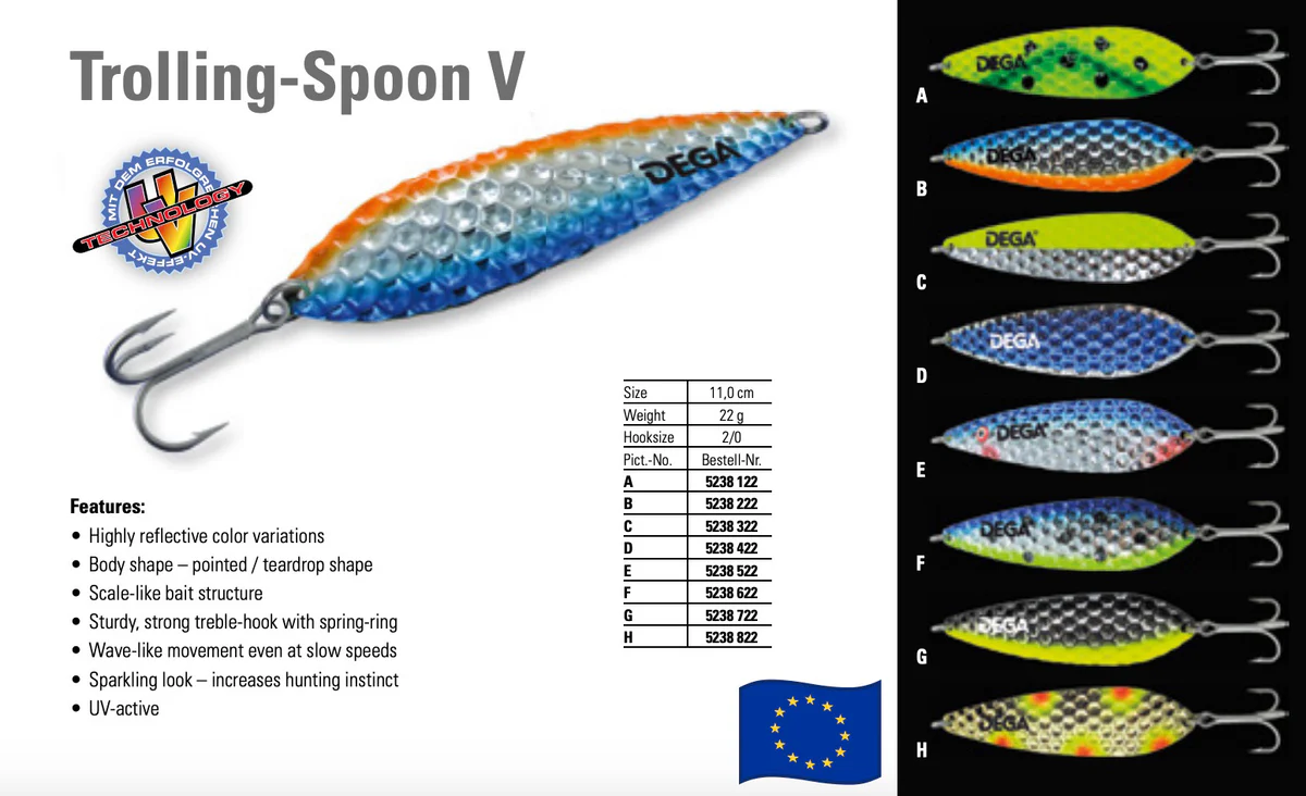 Blizgė Trolling V 110m 22g 2/0,didina medžioklės instinktą – UV aktyvus. Trolling-Spoon savybės: šviesą atspindinti blizgus spalvų variantai, kūno forma – smailas / ašaros formos, tvirtas stiprus trišakis kabliukas su spyruokliniu žiedu, banguotos formos judėjimas net lėtu greičiu.