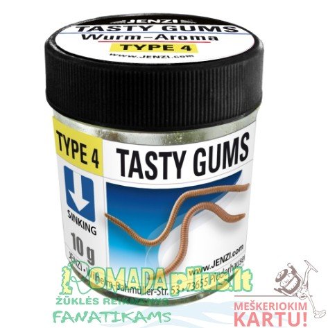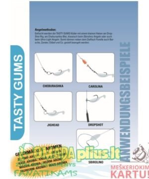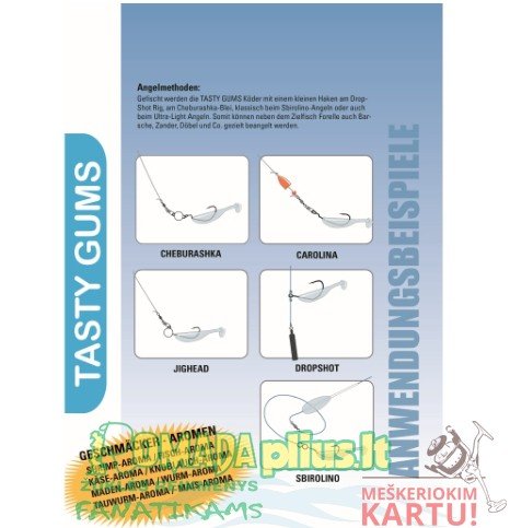 TASTY GUMS – Avižadrebis valgomi guminukai žuvims, aplinkai nekenksmingi plastikiniai masalai – su kvapiosiomis medžiagomis. Gaminant visas TASTY GUMS, naudojama TPR medžiaga (be plastifikatorių). Ši medžiaga yra labai tvirta ir elastinga, todėl masalas yra labai realus.