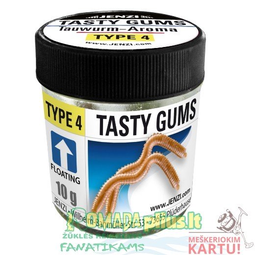Kvapas: visi plastikiniai masalai TASTY GUMS gaminių serijoje turi naturalius, kiekvienai rūšiai skirtingus kvapus. Kvapas patenka į medžiagą ir suteikia jam ilgalaikį poveikį. „TASTY GUMS“ riperiais galima žvejoti, naudojant mažus kabliukus „Cheburashka“, klasikinė „Sbirolino“ žūklė arba ultra lite galvakabliais. Labai geras masalas upėtakiams, ešeriams, šapalams, meknėms, salačiams, karpiams ir karosams bei lynams. Visi TASTY GUMS plastikiniai masalai yra supakuoti į praktišką uždaromą indą. Tai išsaugo kvapą ir skonį ilga laika.