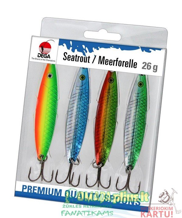 Blizgių komplektas Seatrou 4vnt Sea-Trout blizgių rinkinys Su Šiomis blizgėmis jau ne vienas žvejys pagavo Lašišą. Sea-Trout blizgių rinkiniai patenkina „svarbiausią“ spalvų spektro poreikį pakrantėje. Visi masalai sveria 28 gr. – idealus masalas lengviems ilgiems metimams. Išlenkta forma buvo sukurta taip, kad suvyniojus masalui būtų suteiktas bangos formos judesys. Skendimo fazėje ir vyniojant įjungiamas jaudinantis efektas – tai neleidžia šlakiui atsispirti tokiems masalams. Sudėtis: 4 blizgių rinkinys.