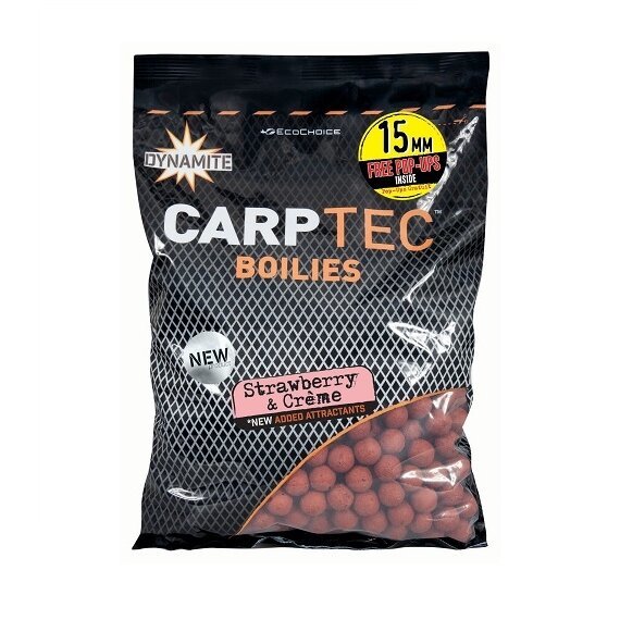Dynamite Baits Carptec Strawberry & Crème boiliai yra kokybiški boiliai, skirti karpių žvejybai. Šie boiliai yra raudonos spalvos ir saldaus skonio. Be to, iš boilių išsiskiria daug atraktorių, todėl jie puikiai tinka momentinei žvejybai. Pridedamas nedidelis maišelis pop-up boiliu, kuriuos galima išbandyti, taip suteikiant žvejams galimybę eksperimentuoti ir optimizuoti kibimo strategijas. Made in England. 1.8kg 15mm
