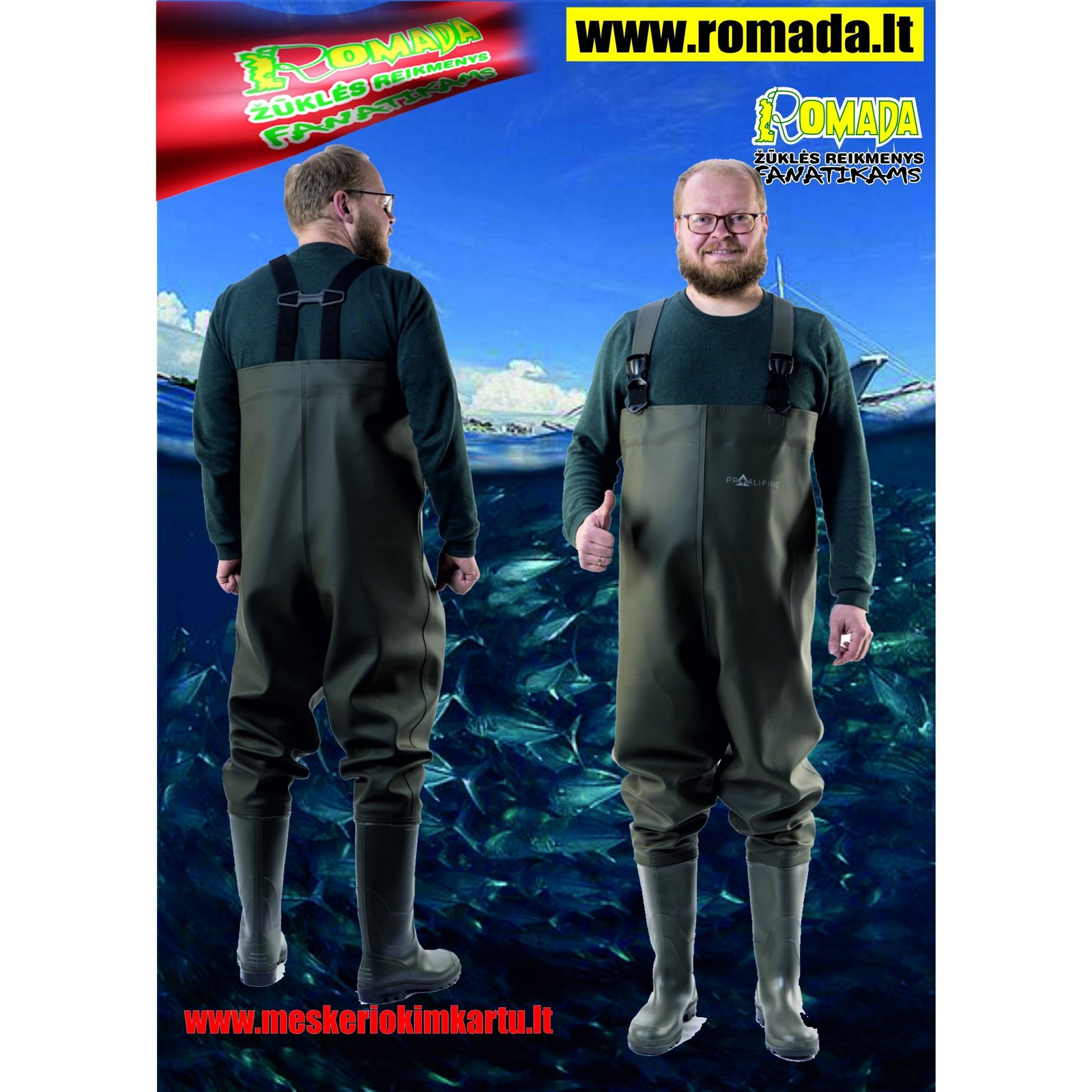 Guminės bridkelnės apsaugo žmogų nuo vandens iki juosmens aukščio. Žvejo batai su patogiomis reguliuojamomis petnešos. Viršus žalios spalvos, padas raštuotas. Botai atsparūs nekoncentruotoms ir silpnoms rūgštims, bazėms, alkoholiui, benzinui, tepalams, dezinfekcinėms priemonėms, augalinės ir gyvulinės kilmės riebalams. Dvipusis jungčių suliejimas su aukšto dažnio srove užtikrina jungčių hermetiškumą. Pagaminta iš drėgmei atsparaus audinio. 100% atsparūs vandeniui.