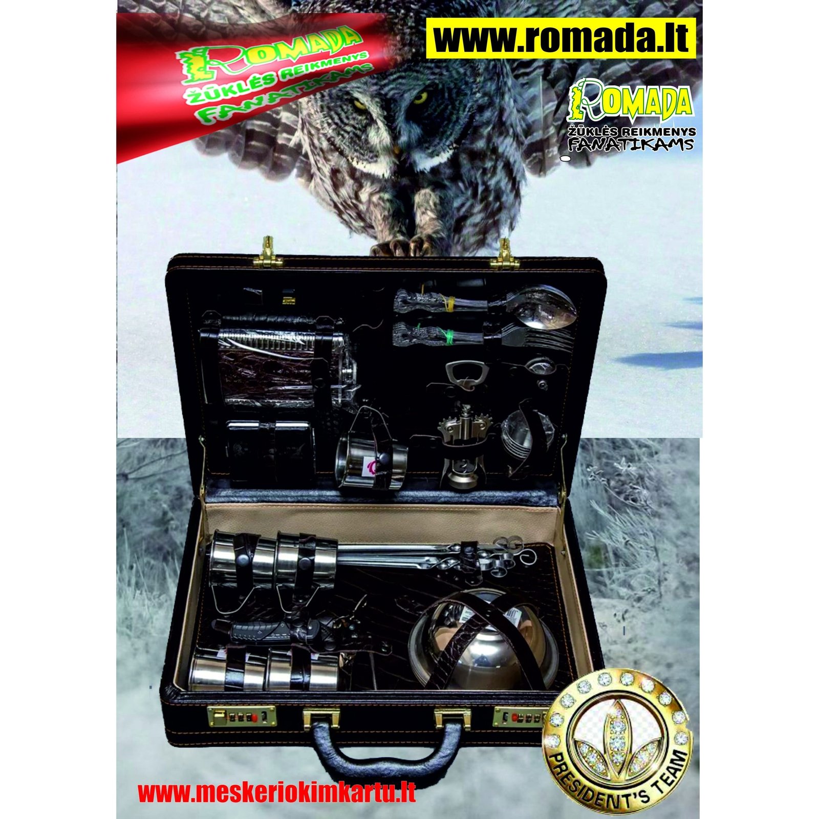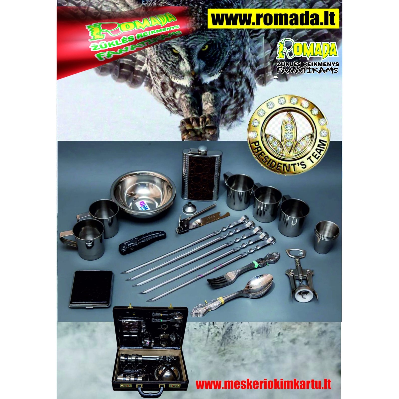 Su šiuo rinkiniu jums nereikės sukti galvos, ką pasiimti su savimi vykstant į lauką Medžioti , Žvejoti, poilsiauti gamtoje: viskas, ko reikia malonioms atostogoms penkių žmonių grupei, jau sukaupta kompaktiškame, patvariame lagaminėlyje. Prezidento rinkinys yra kompaktiško dydžio ir lengvai nešiojamas. Nepakeičiamas išvykoms lauke, žygiams ir iškyloms. Praktiška ir elegantiška dovana medžiotojams, žvejams ir turistams. Rinkinyje yra viskas, ko reikia patogiam poilsiui gamtoje.
