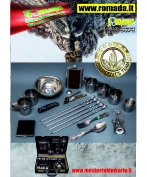 •Lėkštė – 5 vnt; Šaukštas – 5 vnt; Šakutė – 5 vnt; Puodelis – 5 vnt; Kamščiatraukis – 1 vnt; Sulankstomas peilis – 1 vnt; Iešmai – 5 vnt; Puodeliai – 5 vnt; Skardinių atidarytuvas – 1 vnt; Žiebtuvėlis – 1 vnt. vnt.; Termosas- 1 vnt; Porcigaras – 1 vnt; Odinis Diplomatas, Apvalkalas.