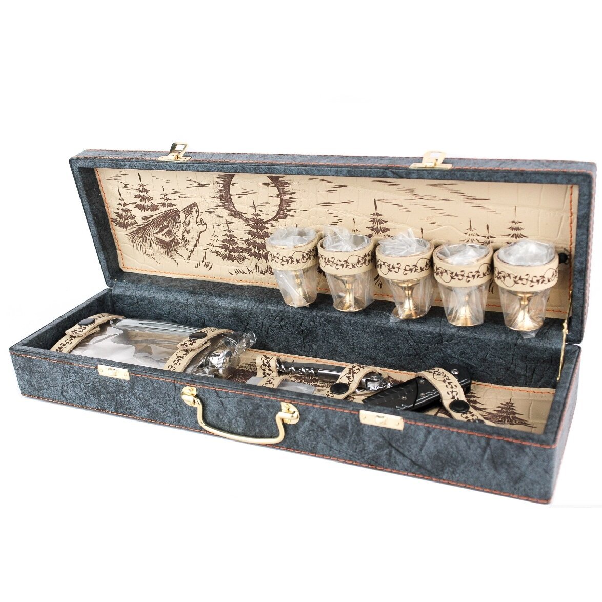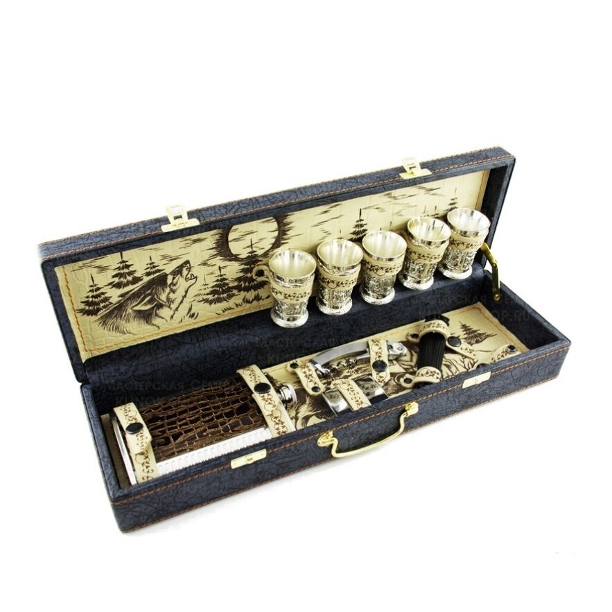 Su šiuo rinkiniu jums nereikės sukti galvos, ką pasiimti su savimi vykstant į lauką Medžioti , Žvejoti, poilsiauti gamtoje: viskas, ko reikia malonioms atostogoms penkių žmonių grupei, jau sukaupta kompaktiškame, patvariame lagaminėlyje. Su šiuo komplektu lengva suorganizuoti patogias atostogas penkių žmonių kompanijai. Todėl geras sprendimas būtų įsigyti dovanų rinkinį iš Dovanų Komplektas Vilkas Fisherman Hunter rinkinys Picnic Gamtoje +Odinis Diplomatas Šio puikaus dėžutės rinkinio interjeras dekoruotas raštais ir etniniais raštais, todėl jis yra išskirtinis. O viduje yra komplektas visko, ko reikia maloniai viešnagei.