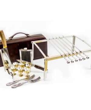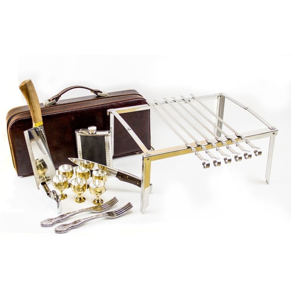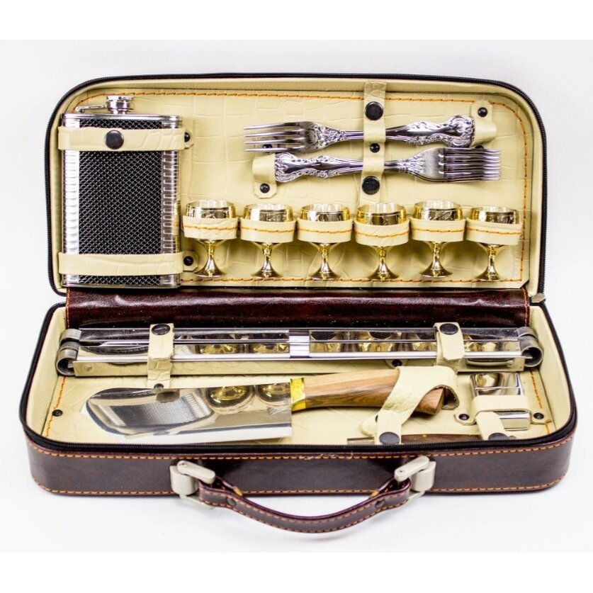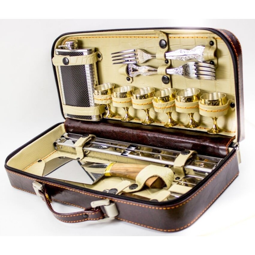 Jei negalite gyventi be išvykų į gamtą, iškylų su draugais ir šeima ar dievinate savo vasarnamį, iškylų rinkinys Exclusive lagamine buvo sukurtas specialiai jums. Jame rasite viską, ko reikia norint skaniai ir lengvai gaminti maistą ant ugnies (iešmai, šašlykinė, gertuvė, peilis kirvis ir peilis), taip pat mėgautis maistu (šakutėmis ir stiklinėmis iš plieno graviuruotas papuošimas). Dovanų rinkinys iškylų indų lagamine yra kompaktiškų matmenų ir sveria tik 2,6 kg, todėl taps jūsų palydovu bet kurioje išvykoje.