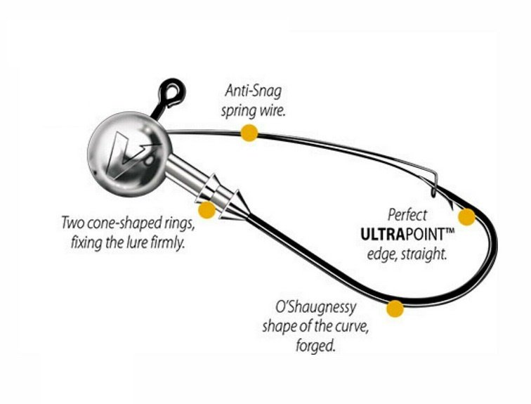 Light to medium jig heads, Mustad-strong hooks. O’Shaugnessy shape and partly forged wire with hand-made anti-snag double wire spring, protecting the hook against weeds, but easy giving way for predator jaws. Hi-Carbon steel.