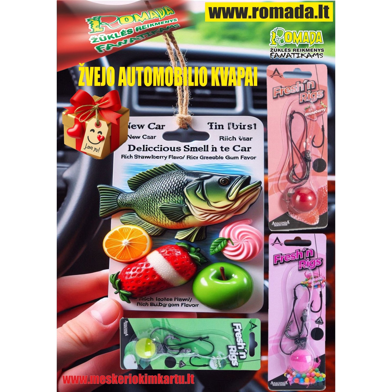 Skleidžia gaivų ir malonų kvapą jūsų automobilyje, namelyje ant ratų ar palapinėje. Maloni staigmena kiekvienam meškeriotojui. Skersmuo: apytiksl. 25 mm. Sudėtis: 1 vnt. Ilgis: 18 cm. Kvapai oro gaivikliai Automobilyje Žvejui- Sodraus Braškės Skonio / Naujo Automobilio Skonio / Sodraus Vanilės Skonio / Sodraus Žalio Obuolio Skonio / Sodraus Buble Gum Skonio / Sodraus Vandenyno Skonio. Šis Aksesuaras papuoš kiekvieno žūklės mėgėjo automobilį. Gera Dovana Žvejui.