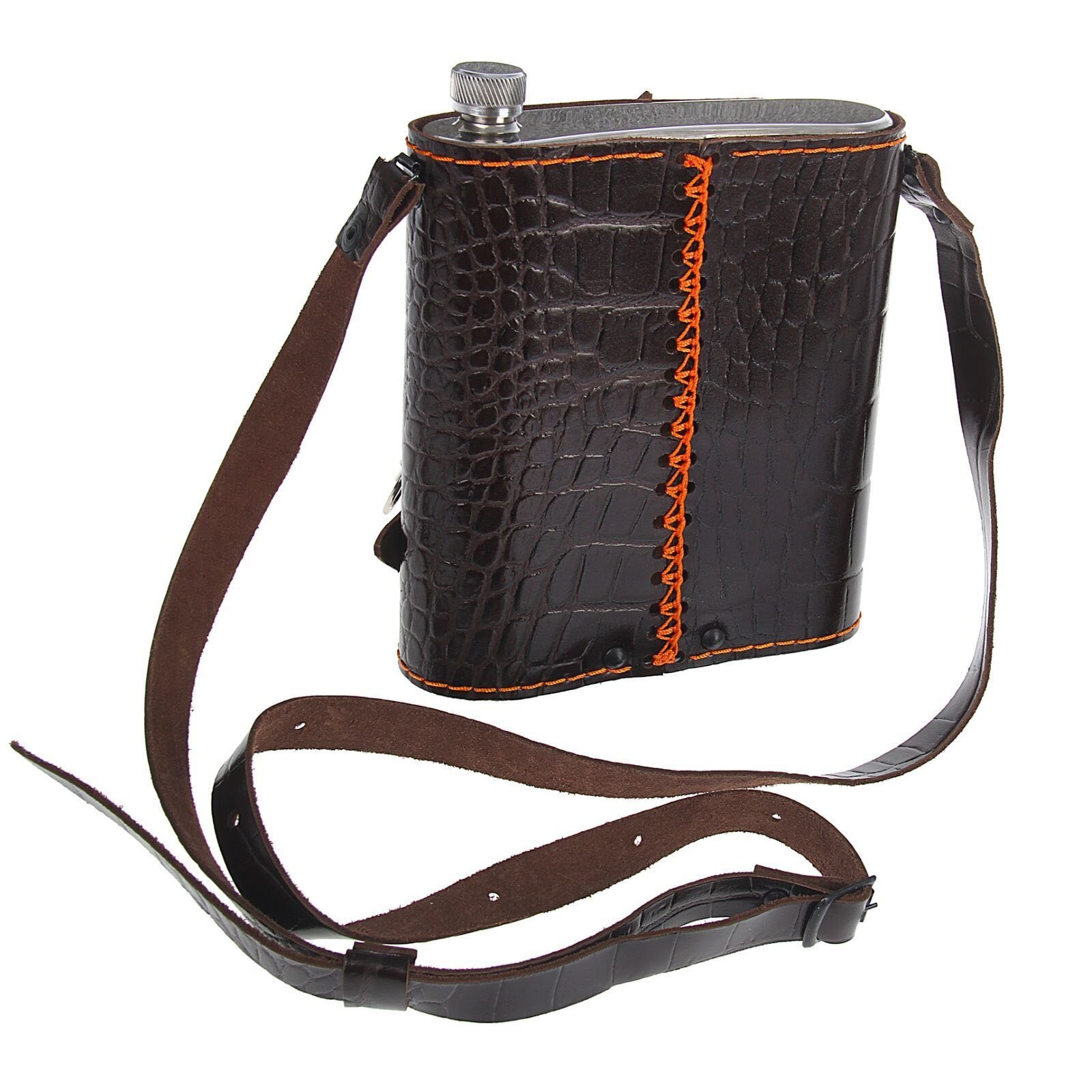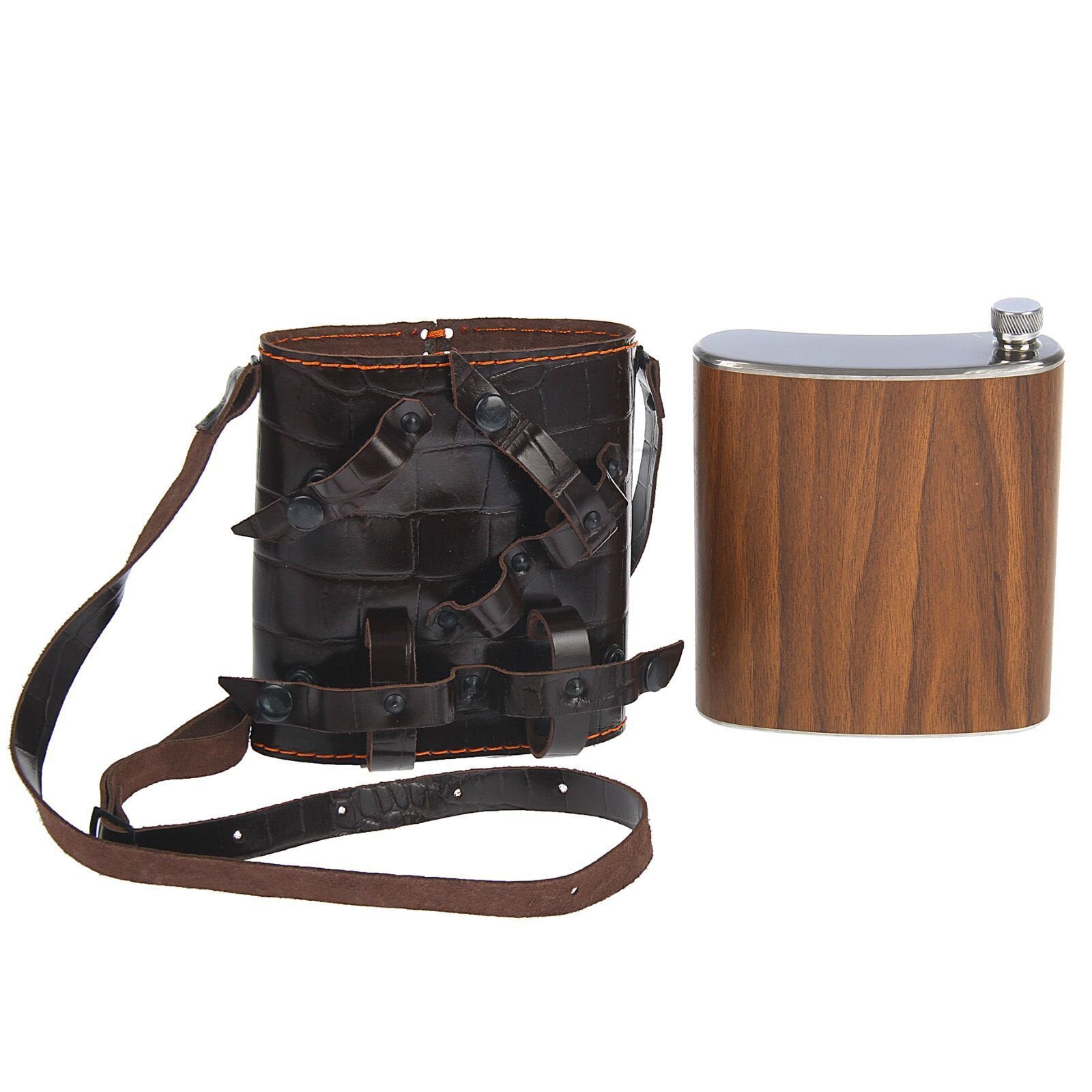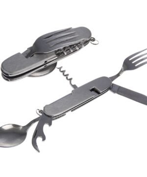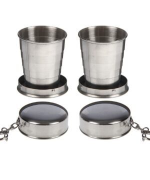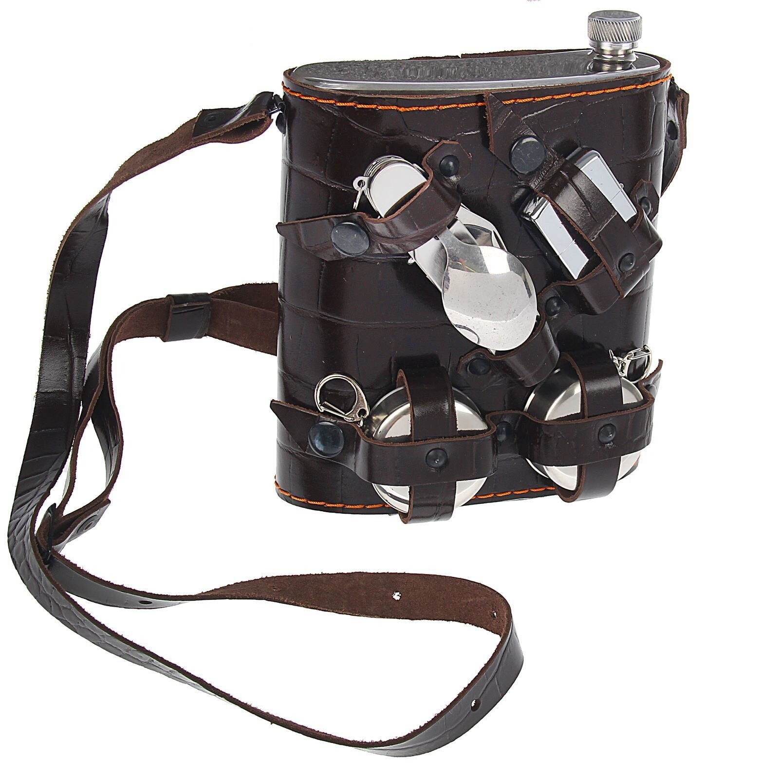 • 1 Gertuvė 1000 ml; • 2 taurelės iš nerūdyjančio plieno sulankstomos, peilis-šakutė., žiebtuvėlis metalinis. Pagaminti iš nerūdijančio plieno ir dekoruoti natūralios odos dėkle .