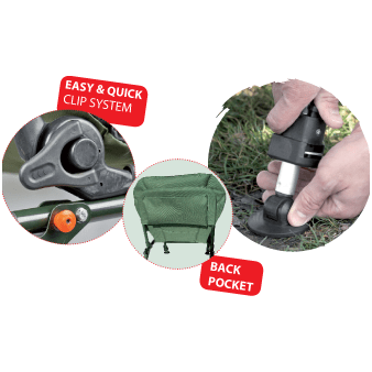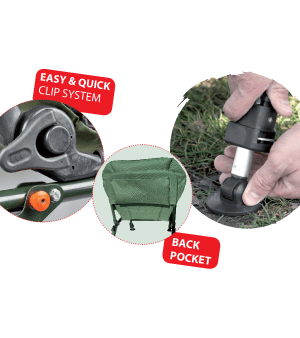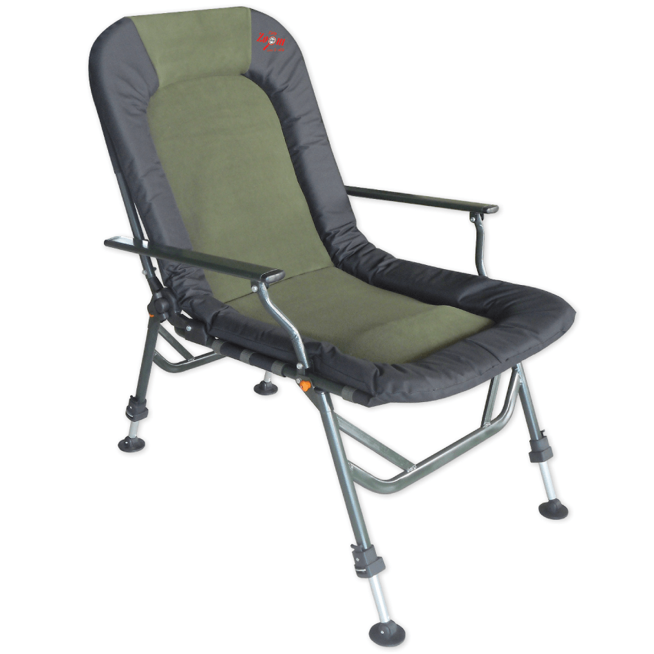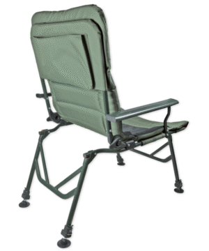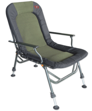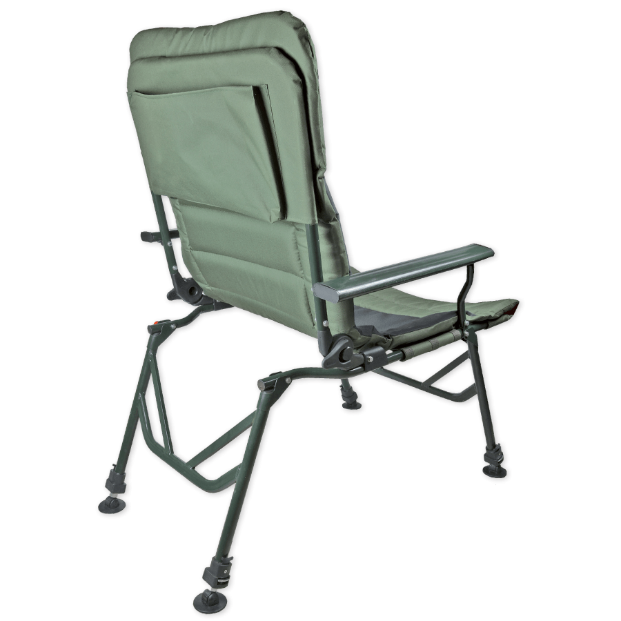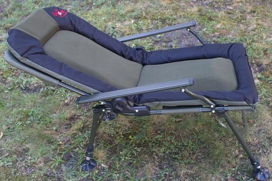 Labai patogi kėdė su porankiais. Rėmo pagrindas su nauja lengva paspaudimų sistema, reguliuojamas atlošas (kelios padėtys) ir reguliuojamos kojos. Paminkštintas galvos atlošas, porankiai ir užpakalinė kišenė suteikia papildomo patogumo. Rėmas pagamintas iš aukštos kokybės aliuminio ir gali atlaikyti meškeriotojus, kurių svoris ne didesnis nei 150 kg. Šio modelio karpių kėdės reguliuojamo aukščio kojos leidžia kėdę pritaikyti bet kokio reljefo, o reguliuojamas atlošas suteikia patogią sėdėjimo padėtį, o tai jūsų buvimą padarys dar malonesnį ir patogesnį.