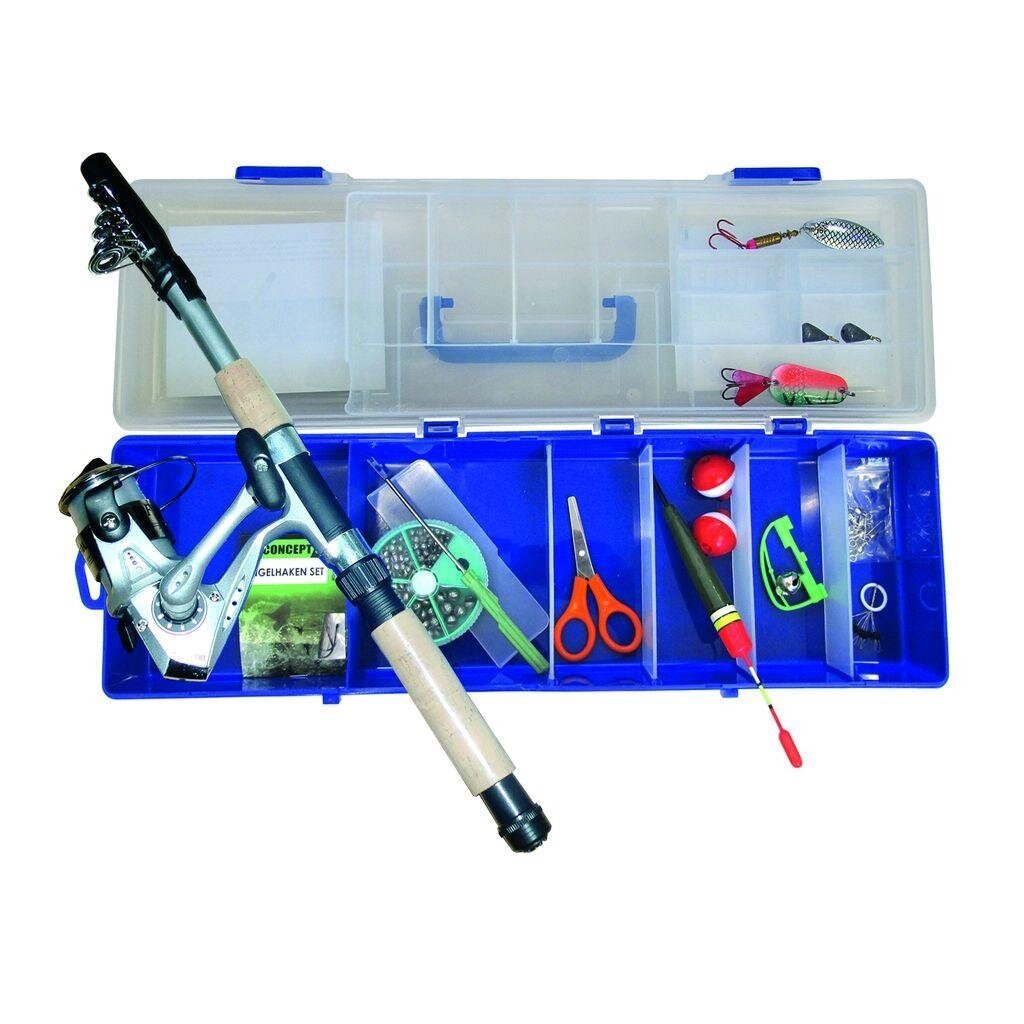 Visas rinkinys pradedantiesiems žvejams. Šis saugus ir patikimas rinkinys apima pilnai įrengtą teleskopinė meškerė su ritė ir valų. Platus pasirinkimas įrankių ir jaukų, reikalingų labiausiai paplitusių šiuolaikinių žvejybos būdų, yra surenktas plastikinėje dėžutėje. Meskite jį į savo kuprinę ir nusileiskite prie vandenens, kur laukia žuvys!