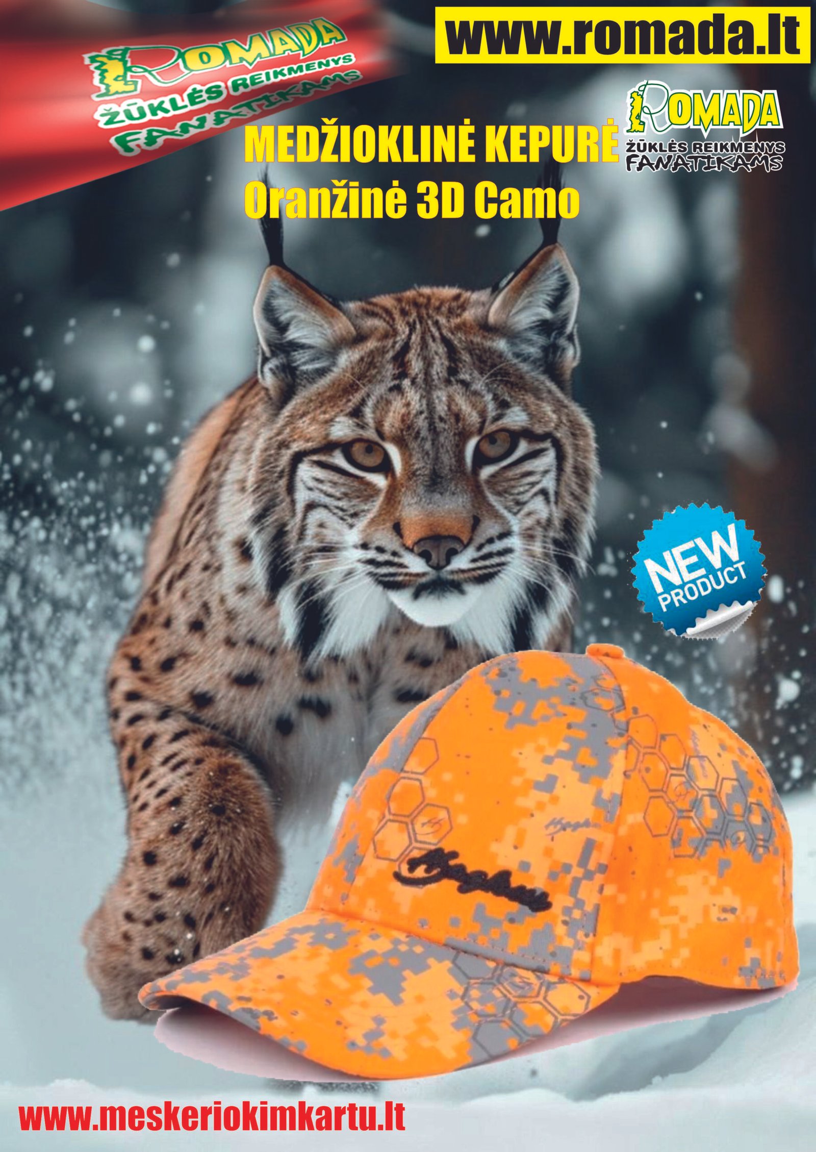 - Medžioklinė Kepurė Oranžinė Kamufliažinė 3D Camo medžioklei Žvejybai .Stilinga Medžioklės ir Žvejybos kepuraitė su oranžiniu „3D kamufliažiniu“ raštu. Kepuraitė patogiai ir tvirtai priglunda prie galvos. Galima rinktis iš dviejų skirtingų dydžių, tad kiekvienas ras sau tinkamą. Kepuraitės priekyje išsiuvinėtas „Medžioklinis“ logotipas. Tinka medžioklei, Žvejybai, stovyklavimui ir, žinoma, kasdieniam naudojimui.