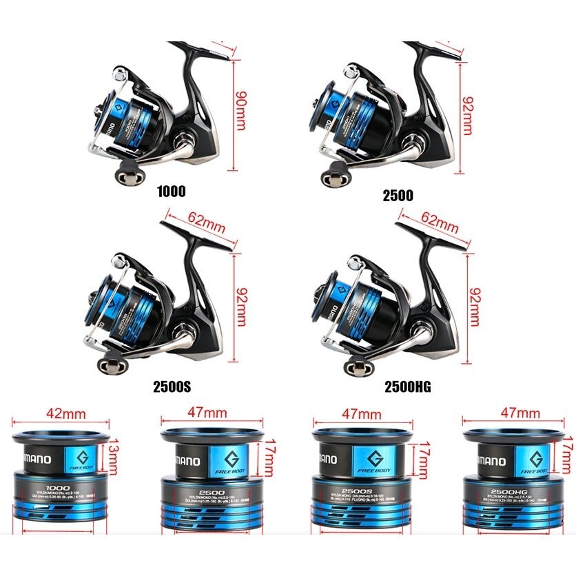 FI 2500 HG – redukcija 6.0:1, 3+1 guoliai, valo talpa mm/m 0.18-290/0.20-240/0.25-160, valo susukimas 91cm, svoris 250g