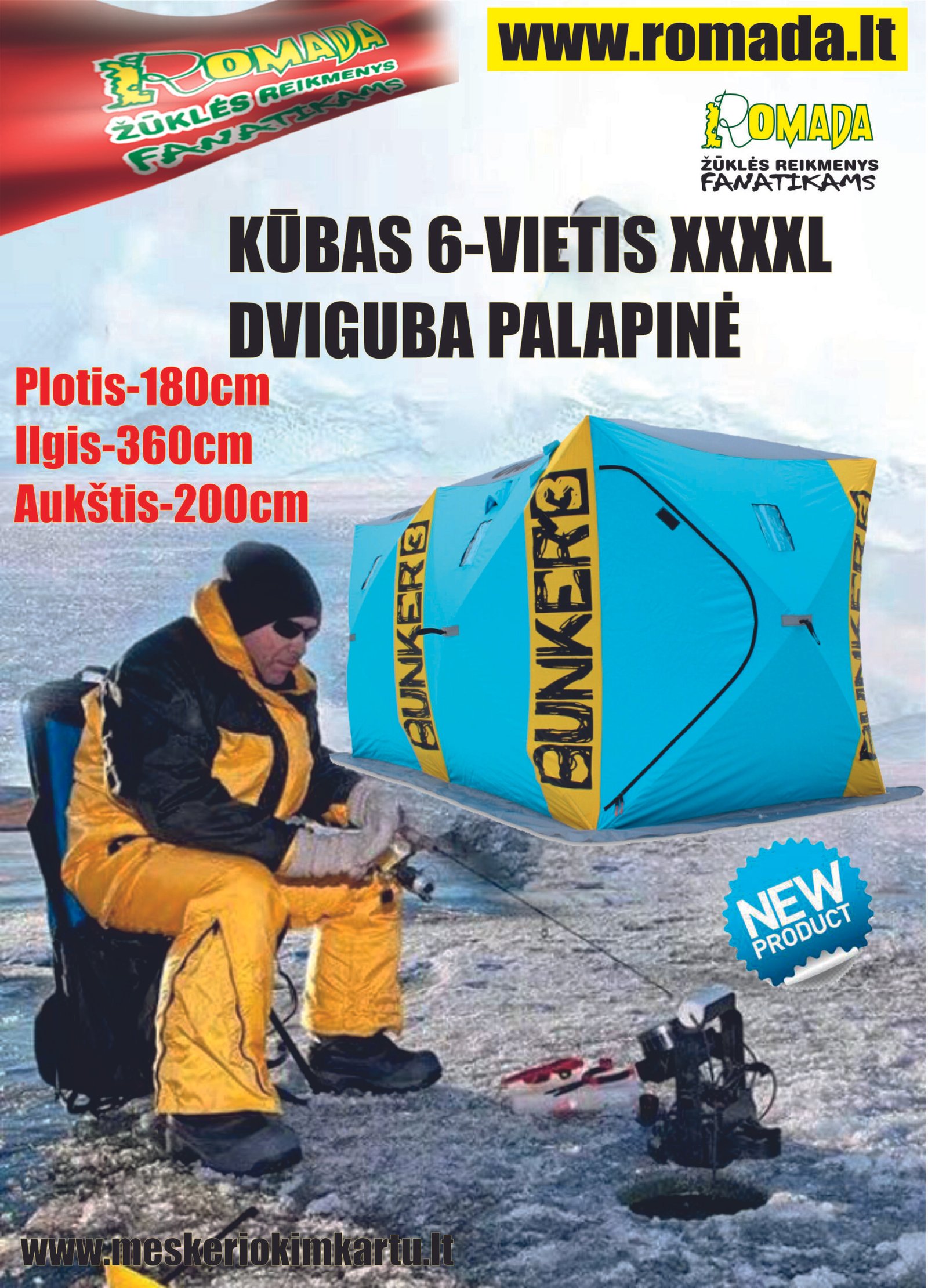 PALAPINĖ DVIGUBA KŪBAS ATIDAROMAS dvi durys skirtinguose kampuose XXXXL -Pastatymas 5min – didelė, įperkama poledinės žūklės palapinė. „Kubas 6“ serijoje pristatoma nauja, didelė poledinės žūklės palapinė – Kubas 6 palapinę praktiškai sudaro dvi iš eilės išdėstytos „Kubas 3“ serijos palapinės, kurios sudaro didelę visumą. „Dvigubas Kubas“ palapinė – tai aukštos kokybės, lengvai naudojama apsauga nuo vėjo ir sniego. Surinkimas. Visos „Kubas 6“ palapinės yra vadinamosios iššokančios palapinės. Surinkimas ir išardymas trunka vos kelias minutes. Didelės palapinės surinkimas yra toks pat paprastas, kaip ir mažesnės. Peržiūrėkite vaizdo įrašą apie surinkimą Tvirtinimas. Visada pravartu palapinę pritvirtinti prie ledo. Netikėtas vėjas gali labai stipriai pagauti palapinę ir ją nunešti, nes sienos yra didelės. Tvirtinimas atliekamas pridedamais sukamaisiais ledo varžtais. Taip pat pridedamos virvės, kurios padės pritvirtinti palapinę. Durys. Abiejuose palapinės galuose yra užtraukiamos durys. Langai ir ventiliacijos angos. Palapinėje yra keli langai ir ventiliacijos angos, kurias galima atidaryti arba uždaryti.
