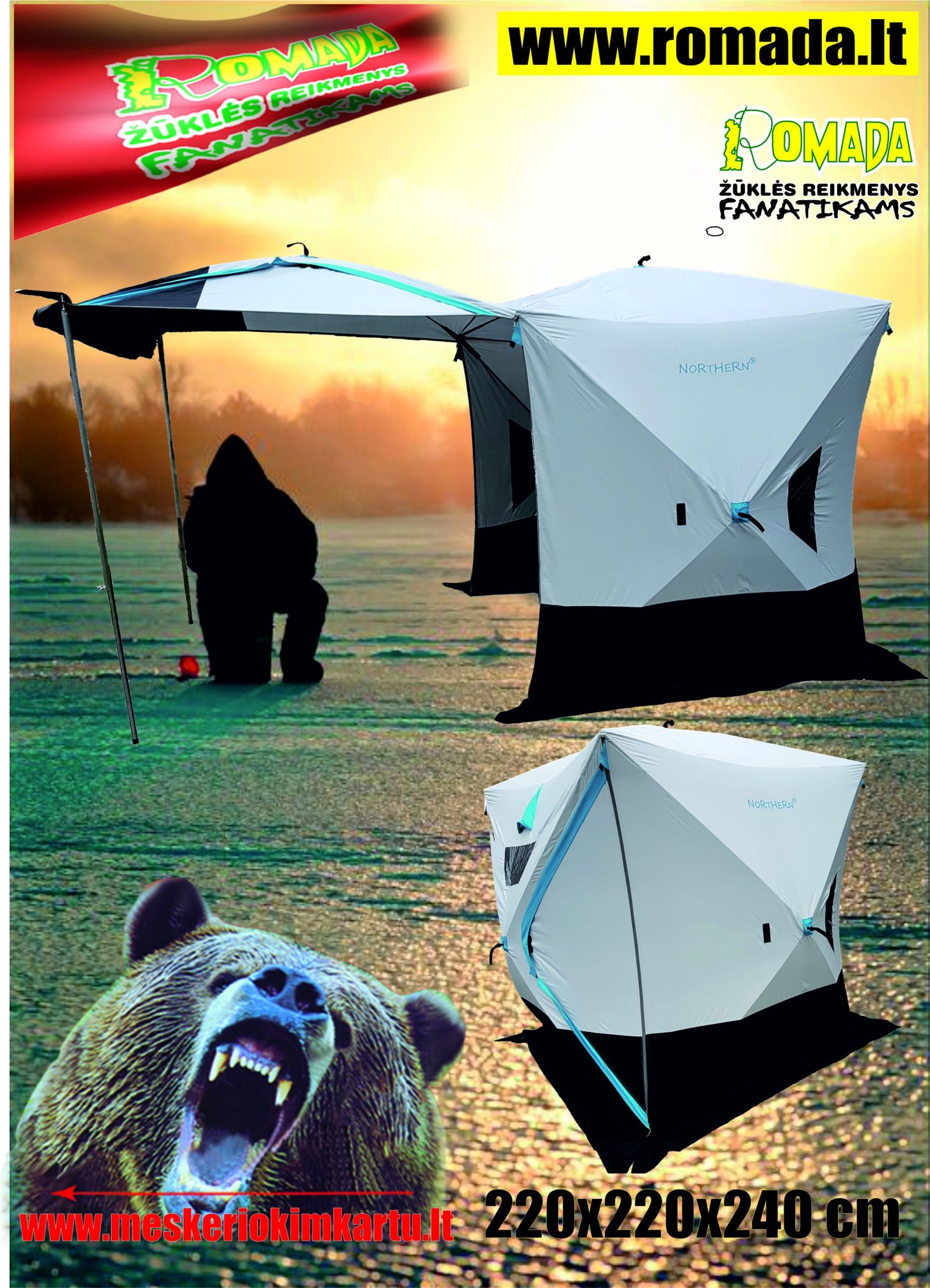 Spalva – šviesiai pilki šonai ir stogas, apačia – juoda Medžiaga – Oxford 300 (atspari vėjui ir vandeniui) Visiškai atidaromas vienas šonas Du įėjimai/išėjimai (priešinguose kampuose) 4 langai / 2 orlaidės Rėmas iš 11mm skersmens stiklo audinio lazdelių Pakeliamo šono atramos – teleskopinės metalinės Patikimi metaliniai šarnyrai 6 įsukami ledo smaigai / 4 virvės atatampoms Viskas supakuota į krepšį su užtrauktuku ir rankenomis