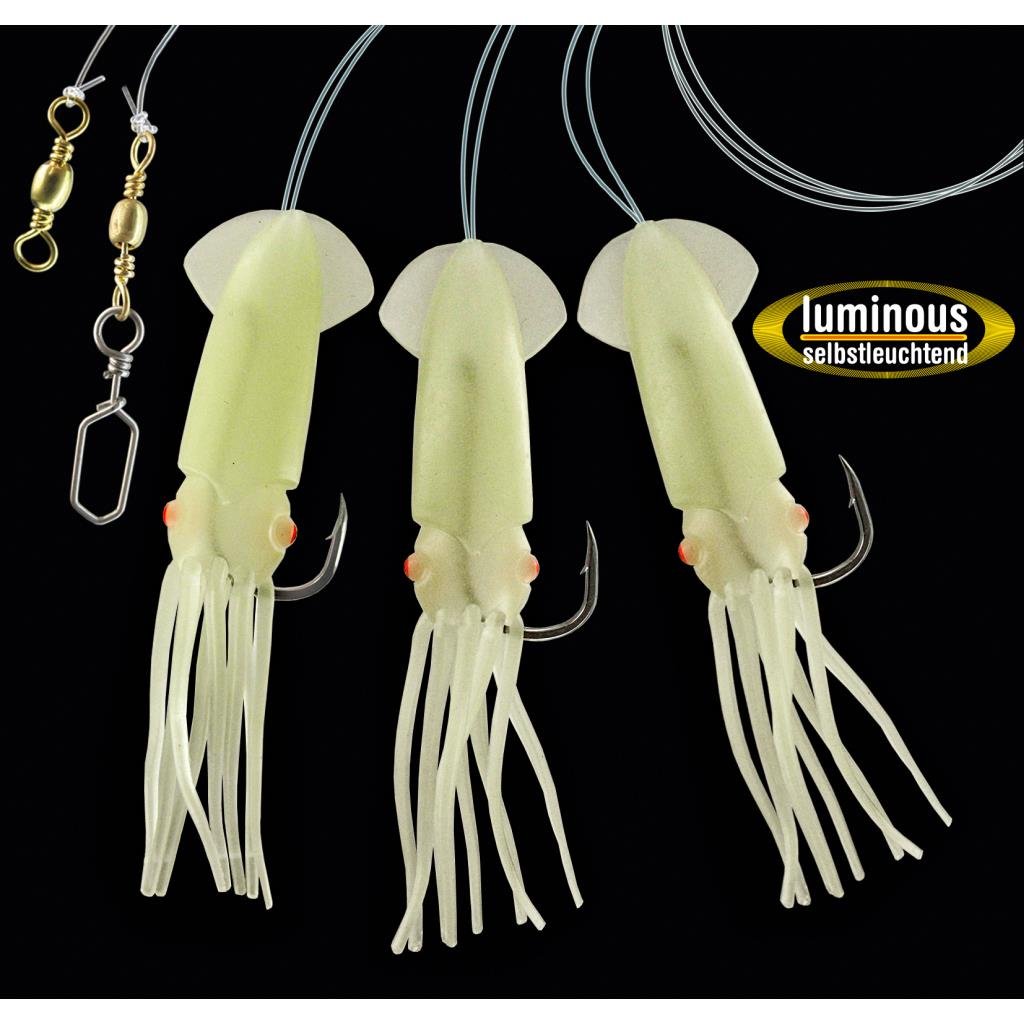 Speciali jūrinė sistema su 3 pavadėliais, UV aktyvus kalmarai 3vnt ir tvirtais pavieniais kabliukais nr. 7/0, skirta žvejybai jūroje. Ilgis 115cm, valas 0,80mm.