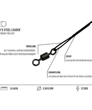 Minkšti ir lankstūs pavadėliai, suvynioti iš 7 atskirų plieninių siūlų [1×7] – idealiai tinka sunkiems vobleriams Tvirtas, patvarus žalią spalvą dengtas nerūdijantis plienas su aukštos kokybės cilindriniais suktukais ir galingais karabinais. Paskirtis: didelės plėšrios žuvys. Pakuotėje 1 vnt. Kilmės šalis: Vokietija.