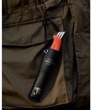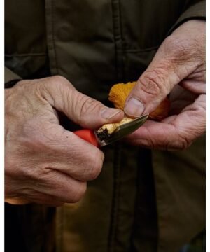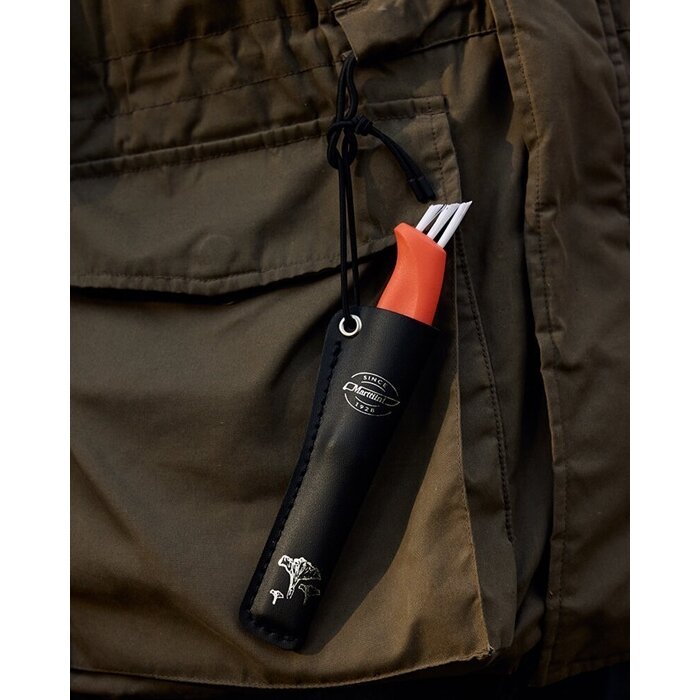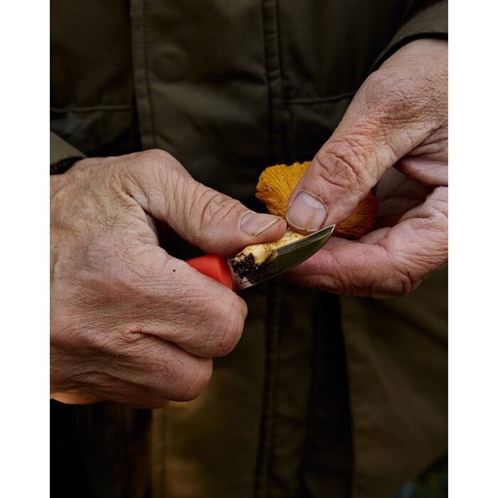 Ryškiai raudona rankena leidžia lengviau rasti peilį gamtoje, nes kartais jis gali pasiklysti. Išlenktos geležtės forma leidžia sklandžiai pjauti stiebą, nepažeidžiant ir neišraunant po ja esančios grybienos. Šepetėlis yra pakankamai standus, kad pašalintų nešvarumus, šiukšles ir vabzdžius, tačiau pakankamai minkštas, kad nepažeistų grybų. Peilis yra tikroje, chromuotoje matinės juodos odos makštyje su sidabro folijos įspaudu. Elastinė tvirtinimo virvelė leidžia lengvai pritvirtinti makštį prie įvairių vietų, tokių kaip diržas, diržo kilpa, riešas ar krepšio rankena. Geležtės ilgis 5 cm. Bendras ilgis 16 cm. Finland.