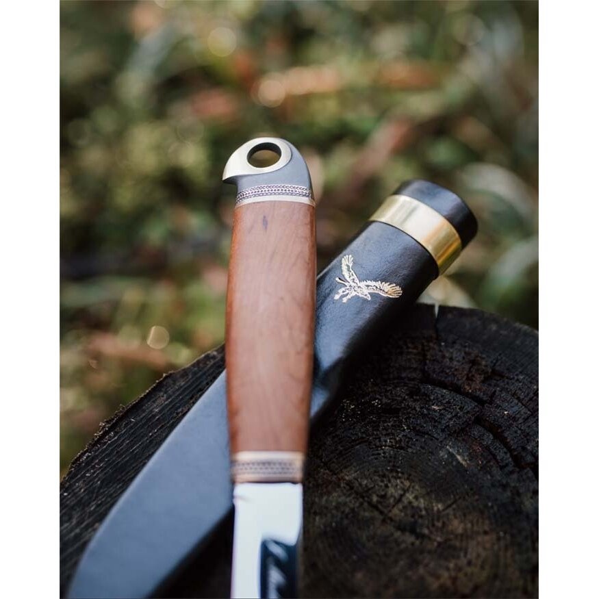 Universalus Eagle Knife yra patikimas peilis, tinkantis tiek lauko entuziastams, tiek kolekcionieriams. Nerūdijančio plieno ašmenys (1.4034, HRC 53,5-55) yra universalūs, o termiškai apdorotos gyslotos beržo rankenos vaško danga su bronziniais antgaliais užtikrina ilgaamžiškumą. Odinis dėklas.