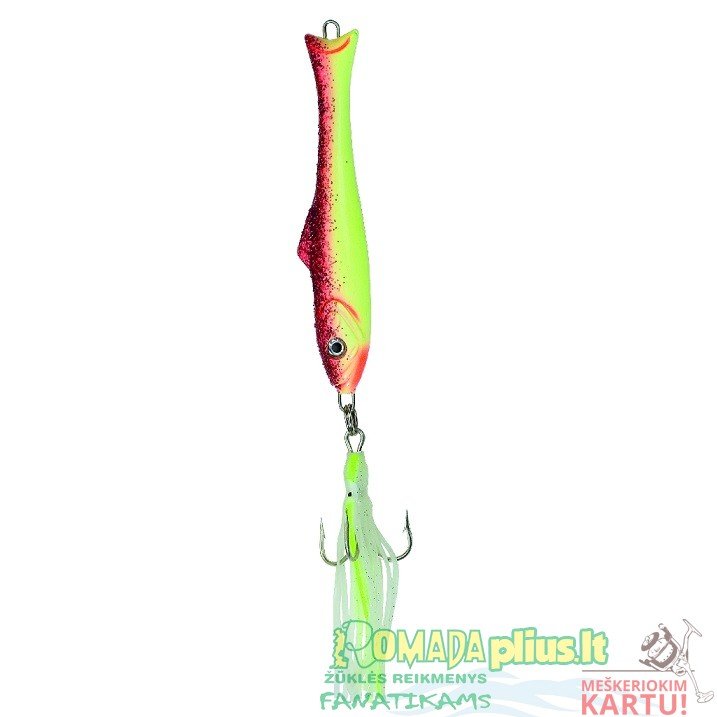 Alesund Octopus-Pirk A masterpiece of a pirk – and absolute effective as well! Lures fish like a magnet! High quality crafted pirk in 150 g for the Baltic Sea, but also in lighter sizes of 150 to 550 g for Norway. A high quality finish of brilliant colors. Mounted to the end of the powerful Mustad hook is a luminous octopus. With mounted octopus!