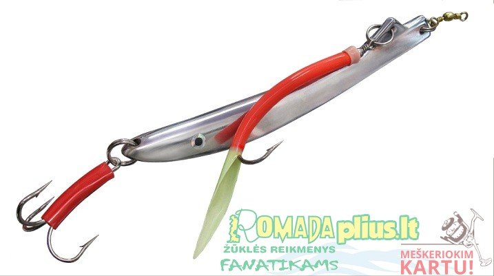Banana-Lure with Rubber-Mack The well known and successful Banana-Lure shape is what makes this an absolute success bait. In addition to shiny reflective color choices (silver, luminous-orange), is an attached rubber Mackerel. With extra strong split rings and hooks.