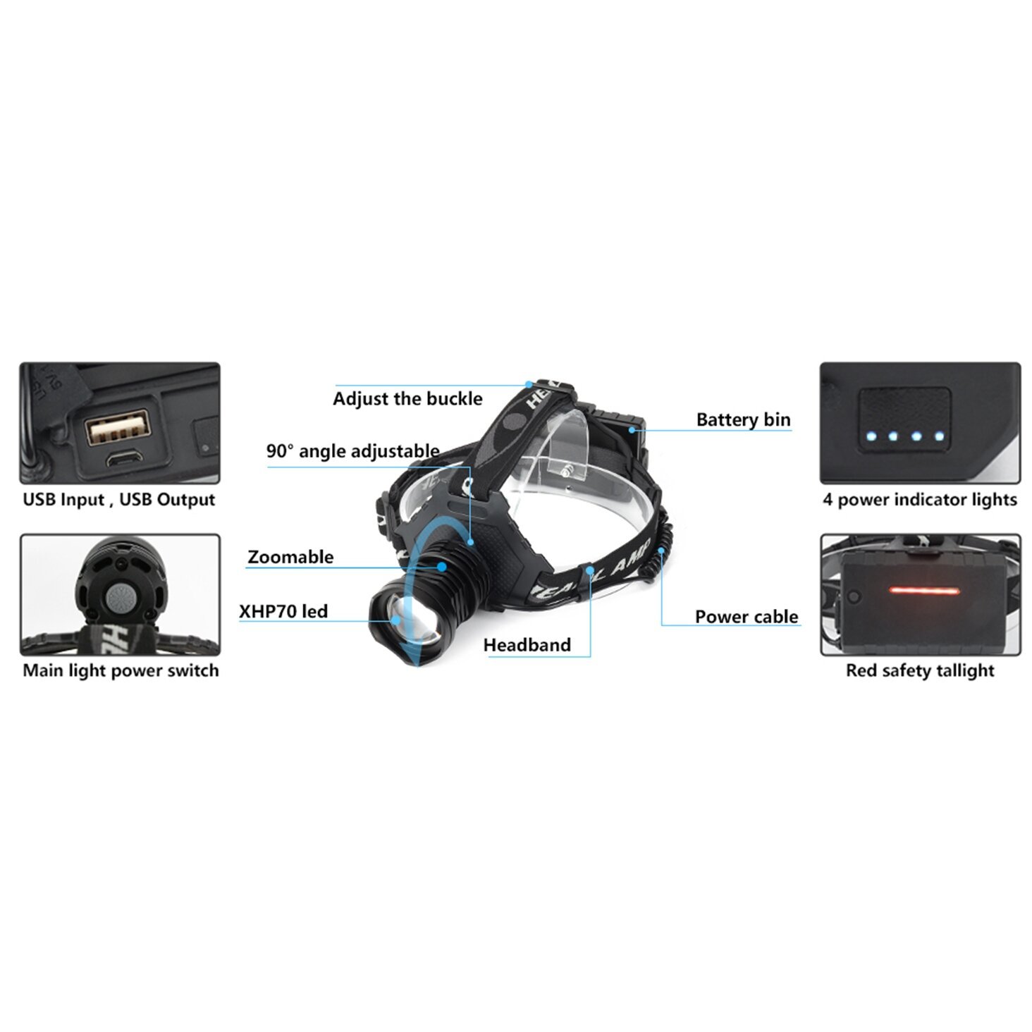 IPX65 atsparumas vandeniui, dulkėms ir pažeidimams. Ryškus priekinis žibintas 12000 liumenų, sukuria 5 šviesos režimai: maksimalus, vidutinis, mirksintis, (balta) ir maksimalus, vidutinis UV (mėlyna) šviesą. Raudonas galinis žibintas ir reguliuojamas 90 laipsnių galvos žibintas puikiai tinka bet kokiam taktiniam naudojimui. Prožektorius dėl reguliavimo galimybių leidžia gauti daugiapakopę šviesą, sklandžiai prisitaikančią prie esamų poreikių ir esamų sąlygų. Siauras šviesos spindulys leis tiksliai apšviesti tolimus taikinius, o platus spindulys puikiai tiks iš arti. POWERBANK funkcija – žibintas su įvesties USB ir išvesties prievadu. Jis gali ne tik įkrauti baterijas per įvesties usb prievadą, bet ir įkrauti telefoną, ausines avariniu atveju su išvesties prievadu. Indikatoriaus lemputė – mūsų priekinių žibintų galios indikatorius ir raudona įspėjamoji lemputė gale. Maitinimo indikatoriaus lemputė leidžia mums aiškiau suprasti likusią naudojamą galią. Įspėjamoji raudona lemputė gale – tai papildoma apsauga važiuojant ir einant.