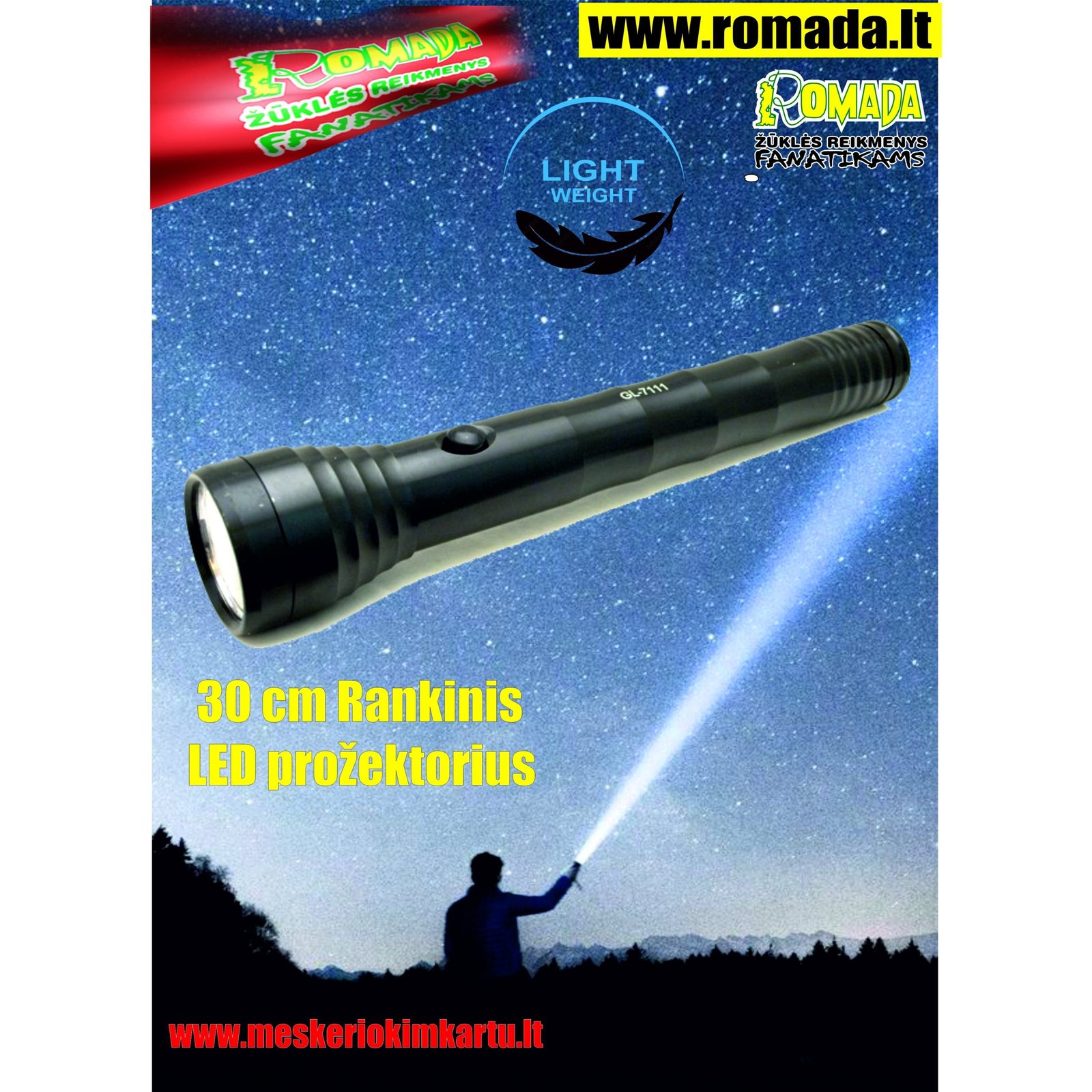 30 cm Rankinis LED prožektorius kurio korpusas pagamintas iš tvirto aliuminio ir praktiškai nebijo smūgių. Rankena su išfrezuotais neslystančiais grioveliais. 3W LED lemputė gali tarnauti 100 000 valandų. Žibintas nebijo drėgmės, bet neskirtas nardymui.