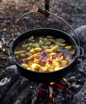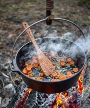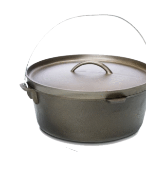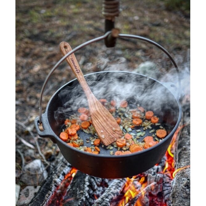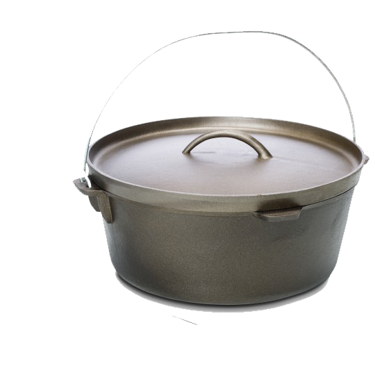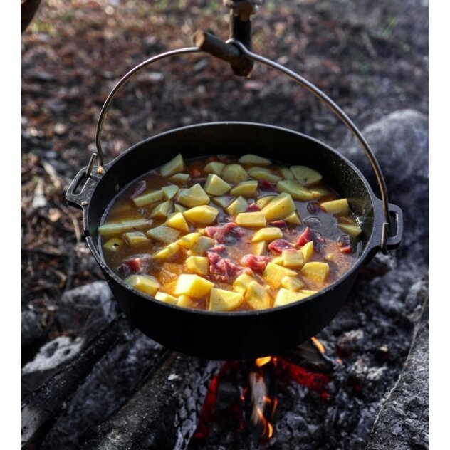 18 litrų talpos ketaus (špižinis) katilas su dangčiu ir rankena kabinimui virš laužo.