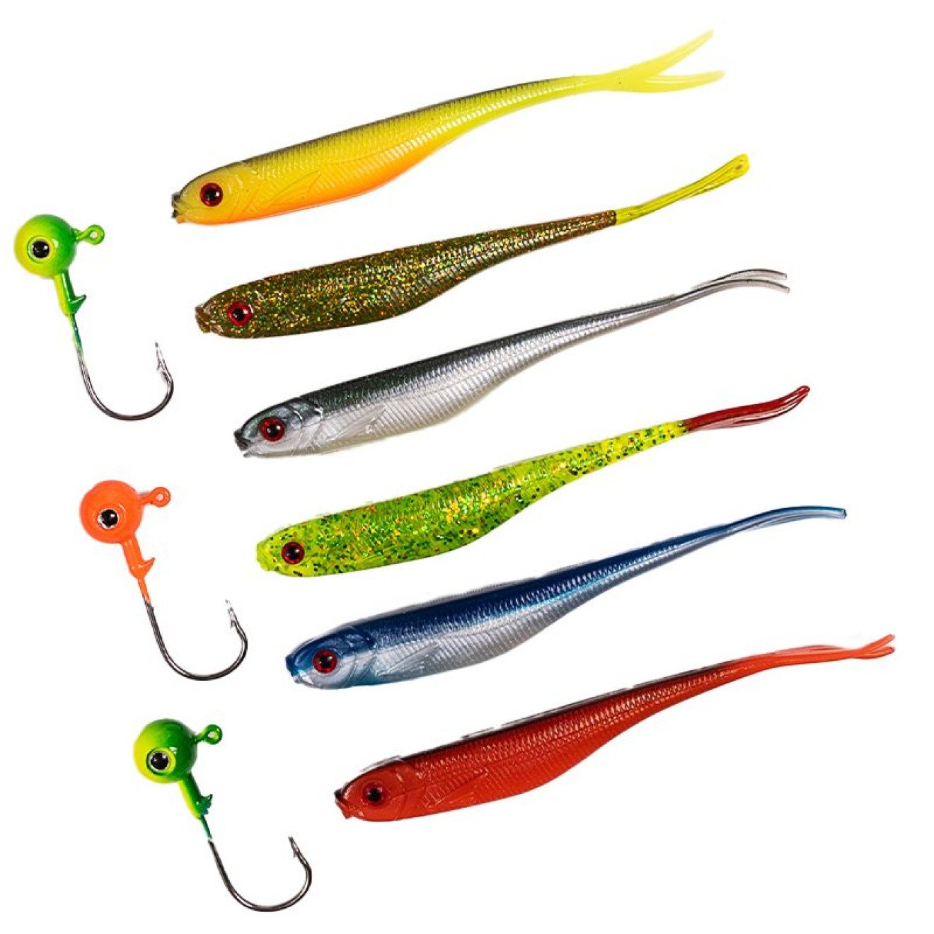 Komplektacija (3×6): Rinkinį sudaro 6 vnt. minkštųjų masalų bei 3vnt tinkamo dydžio galvakabliai (jig heads).