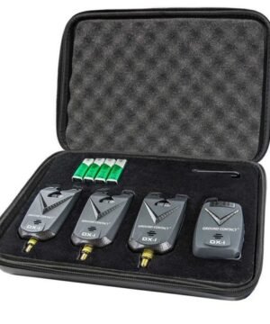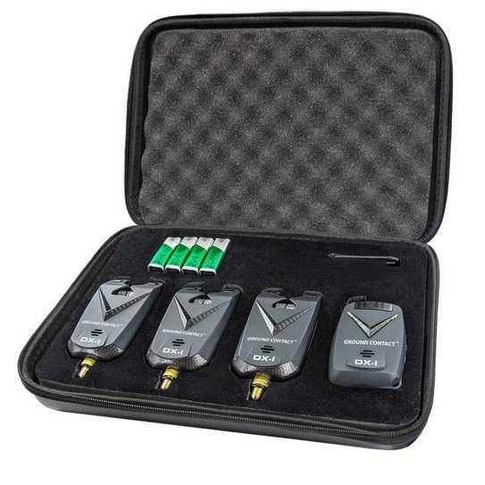 Wireless Bite-Detector-Set DX-1 (3 piece set with blue LED`s )The DX-1 Wireless Bite Detector-Set was tested and developed on an electronic circuit over an extended period of time. All aspects relative to creating a modern wireless bite detector such as design, compactness, technic, and durability were taken into consideration. (The set can be expanded to handle up to 5 bite detectors). The set is made of 3 units (3 x blue LED), while the bite detector has 5 levels of volume, pitch, and sensitivity, extremely bright blue LED, night light, and a range of approximately 150 m. (The bite-detector requires a 9 V battery ). Product specifications: – Adjustable Pitch / Volume and Sensitivity – 8 setting levels – Automatic run / bite distinction with different colored LED`s – Night light function – Connection jack for optical bite-detector ex. JENZI-Rollever bite-detector ). – Mute function – Automatic receiver recognition – Rubber coated housing – Durable transport case – Optionally expandable to 4 bite-detectors Set 3 Bite-Detectors + Receiver .