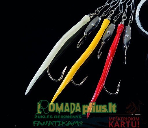 Sistemėlė jūrinė Norvegijai Jūrinei Žūklei Raudonų Ešerių, gaudymas prasideda nuo 20m gylio iki 400m būna įvairiai. Sistemėlė jūrinė Norvegijai Pipirai su blizgutėmis Jūrinei Žūklei Raudonų Ešerių ir Menkių žūklei 0.80mm Kab-Nr. 8/0 Ilgis 4m Galima ant sistemos sumauti porcijas dažniausiai saidos papilvės puikiai tinka, svoris gale kabinasi 500g / 700g arba 900g ir daugiau, kad greičiau nuskęstu iki ešerių tunto. O menkių žūklei nieko nereikia, tik gale prisegti pilkerį. Sistema pipiras blizgė kuri sukasi aplink savo ašį ir imituoja mailiaus būrį.Tai viena iš tobuliausių sistemų jūriniai žvejybai.