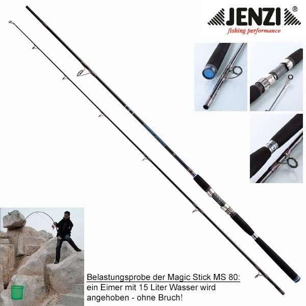 MAGIC STICK Built for powerful use Pictures speak louder than words – take a look at the photograph. Here a pail filled with 15 liters of water is being lifted by a MAGIC STICK without breaking! You are thinking, that must be a heavy weight rod? Wrong! The rod itself weights only 191 gramm and has a casting weight of 45 – 80 g. That is MAGIC! -Super light and super strong -Equipped with the convincing P-C-G guide system -Ergonomically formed handpiece -For Mono- as well as Multifilament line -CONCEPT reel seat for better stability -Highly concentrated EVA-Handgrip -Multi-coated blank -Pressure sealed guide fasteners