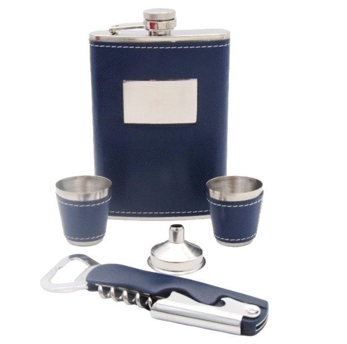 Gertuvė, dvi taurelės iš nerūdijančio plieno, piltuvėlis ir atidarytuvas, dovanų dėžutėje.
