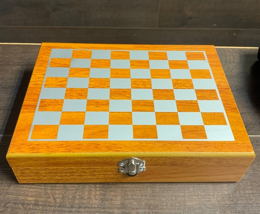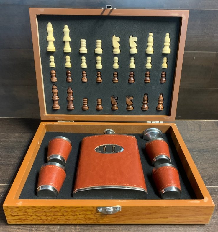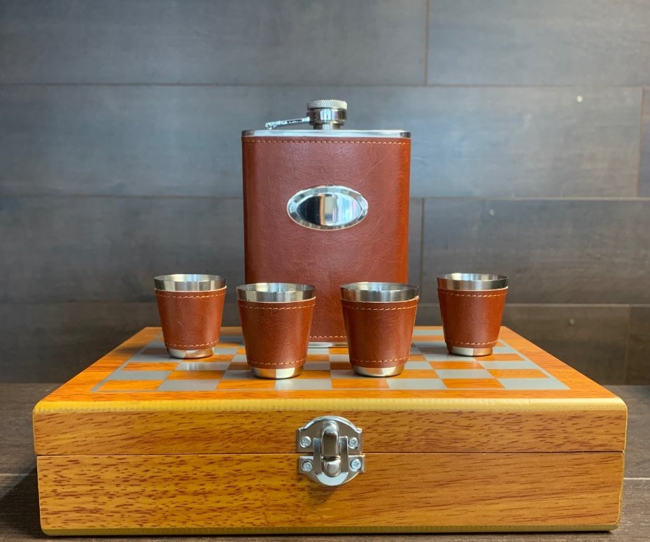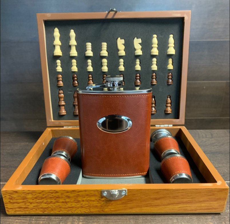„Just Flask“ naujas 6 uncijų (170 g) nerūdijančio plieno gertuvė ir šachmatų rinkinys su 4 vienodais (čierkom) taurelėm. Šis rinkinys yra labai vertingas ir išties labai gerai pateiktas, aptrauktas tikra ruda oda, o 4 nerūdijančio plieno taurelės puikiai užbaigia rinkinį. Tai tikrai puiki dovana ypatingam žmogui arba kai norite tiesiog save palepinti. Pagaminti iš nerūdijančio plieno, jie yra lengvi, bet tvirti ir, žinoma, gali būti graviruojami, kad suteiktų asmeniškumo. (Šią gertuvę galima graviruoti tik ant priekinės panelės, pečių arba pagrindo!) Nesvarbu, ar ieškote suasmenintos gertuvės gimtadieniui, vestuvėms, bernvakariui ar mergvakariui, ar pasiimti į kitą kelionę ar žygį, „Just Ask“ – „JustFlask“!