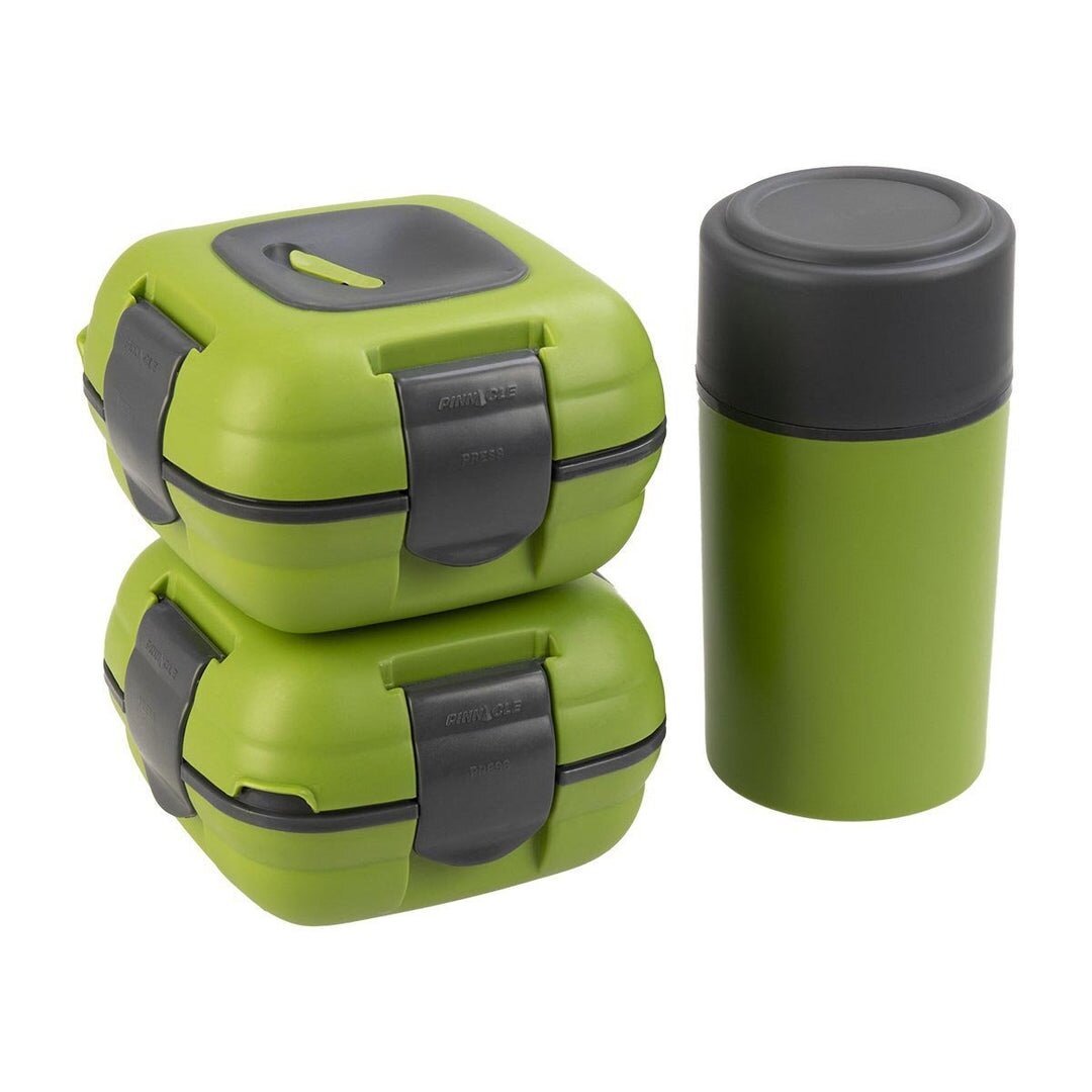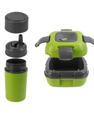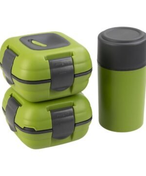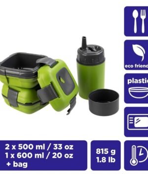 PILNAS PIETŲ RINKINYS: 2 vnt po 500ml termo plastikiniai pietų indai, 600ml termo butelis ir termo rankinė.