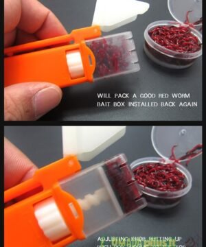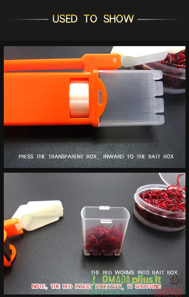 Dėžutė skirta laikyti ir suverti uodo trūklio lervas neliečiant lervų, labai pagreitina jų suvėrimą ant kabliuko, be jokio vargo.
