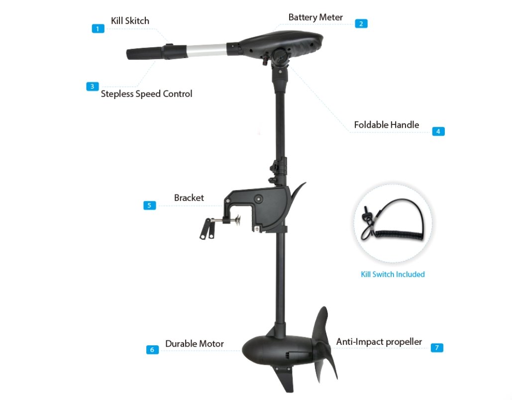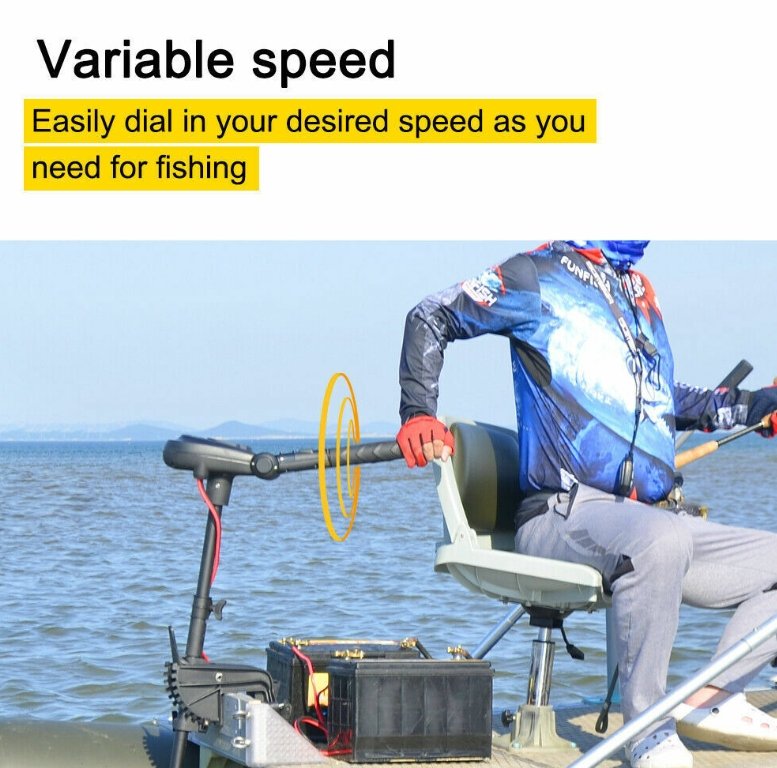Galia – 110 Lbs / 900W / maks 75 Amp / apie 3-4 AG kaip traukos ekvivalentas benzininiam varikliui. Tokios galios pakanka varyti didesnę valtį, jachtą, motorlaivį ar plaustą. Vidaus vandenyse nei vėjas, nei bangos nesutrukdys pasiekti numatytų tikslų. Trijų menčių sraigtas sukurs optimalią trauką ir greitį.