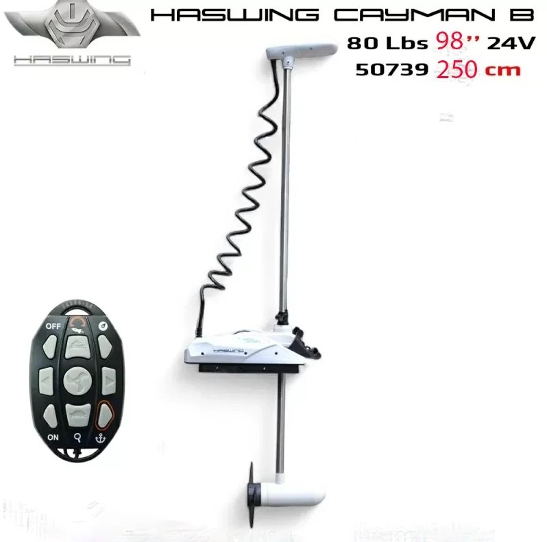Dviejų ašmenų atrama, skirta montuoti ant laivapriekio, užtikrina trauką, kurios reikia vidutinio dydžio laivams iki 21 pėdos valdyti. Vandeniui atsparus belaidis CAYMAN valdiklis lengvai telpa į delną arba gali būti pritvirtintas prie meškerės arba ant kaklo su virveliu. Nuo komponentų dizaino iki kiekvienos naujos funkcijos – HASWING CAYMAN pritrauks jus kaip geriausiai veikiantis, geriausiai suprojektuotas belaidis elektrinis velkamasis variklis savo klasėje.