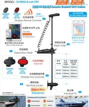 CAYMAN -B GPS gali būti naudojamas tiek gėlo, tiek sūraus vandens sąlygomis, jam suteikiama dvejų metų gamyklinė garantija. 80 svarų traukos jėga leidžia visą dieną plaukioti valtimi su vienu gilaus ciklo akumuliatoriumi.
