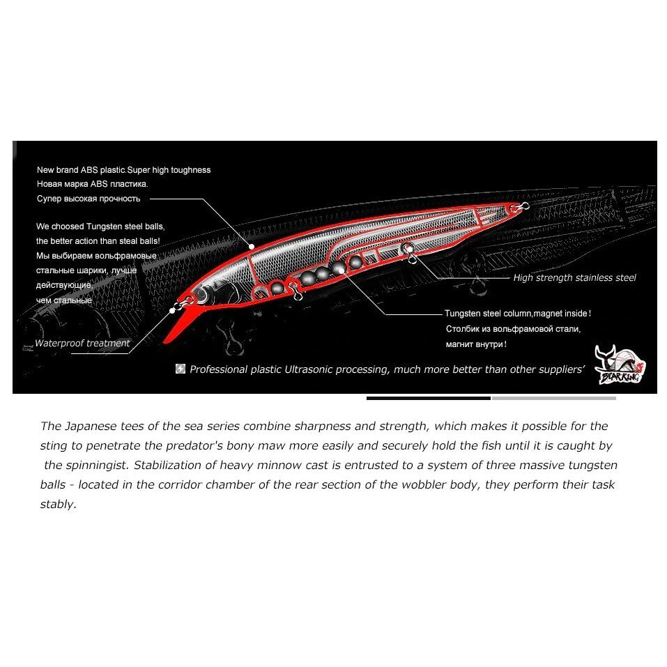 Voblerio ilgis – 160 mm, svoris – 30 gramų, gylis nuo 0,8 iki 1,2 metro, plūdrumo tipas – plūduriuojantis. Masalui sumontuota trijų volframo rutuliukų pavidalo tolimojo užmetimo sistema, kuri užmetant juda į uodegos dalį, o ištraukimo metu grįžta arčiau galvos, todėl vobleris gali skristi toli ir tiksliai.