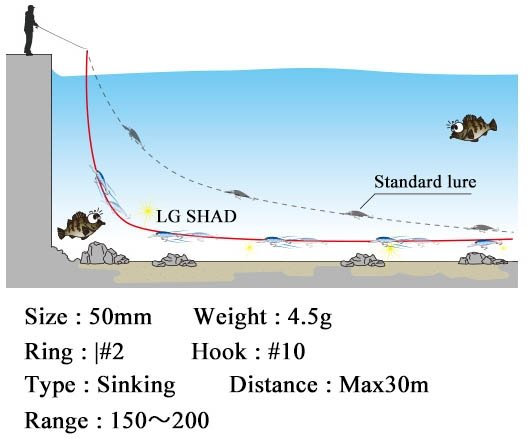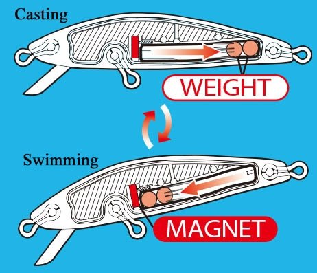Naujas magnetinio svorio perkėlimo sistemos modelis – TARPTAUTINIS PATENTAS. Funkciškai patobulinta naudojant 20% galingesnį magnetą. Suderinamas su „Super Long Cast & Better Action“ net ir lengvu svoriu. Puikiai tinka nuotoliniam užmetimui (net iki 30m) ir aukštai pozicijai. Vobleriai yra pagaminti iš aukštos kokybės plastiko, kuris gali atlaikyti daugybę plėšrūnų išpuolių. Korozijai atsparios nerūdijančio plieno jungiamosios detalės yra labai patvarios. Vobleris aprūpintas 2 aštriais trišakiais.