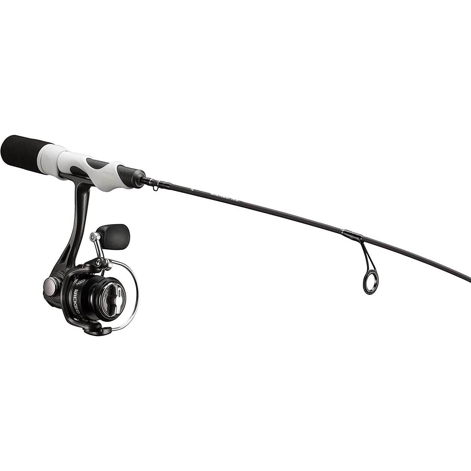 Poledinės žūklės ritė su ilgu koteliu, skirta naudoti su kumštinemis pirštinėmis ir storomis pirštinėmis.