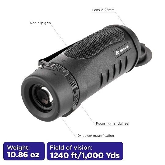 GALINGAS: mėgaukitės savo nuotykių lauke vaizdais. Pamatykite iš arčiau naudodami 10 kartų padidinimą, 32 mm objektyvą ir 1240 pėdų 1000 jardų matymo lauką.