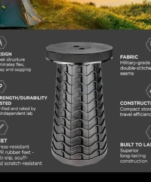 Nešiojama sulankstoma kėdė: aukštis 47cm, plotis 25cm. Aukštis gali būti reguliuojamas pagal poreikį. Sulankstoma kėdė yra labai lengva, sveria tik 900g. Daugiafunkcinės sulankstomos taburetės maksimali apkrova yra 220 kg, pagaminta iš itin tvirtos nailono ir PP medžiagų. Puikiai tinka žvejybai, stovyklavimui, kelionėms, sodininkystei. Spalva: juoda/raudona.