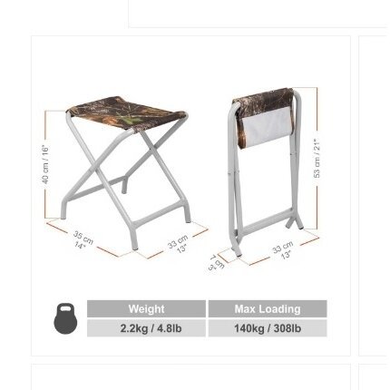 Sulankstoma kėdutė pagaminta iš lengvo ir tvirto, aukštos kokybės (0,74 colio skersmens) plieno ir 600D Oxford audinio. Svoris 2,2kg, matmenys: 35 x 33 x 40 cm. Maksimali apkrova 140kg.